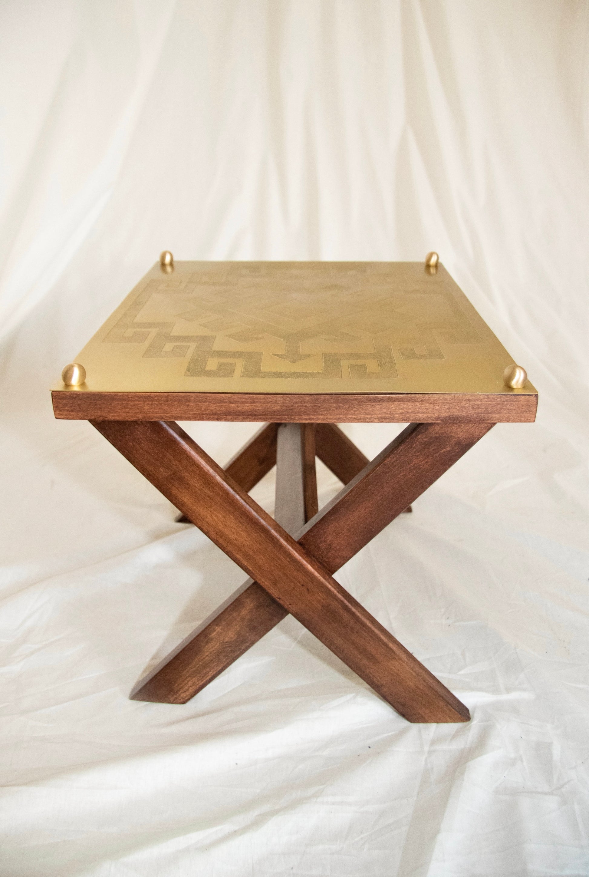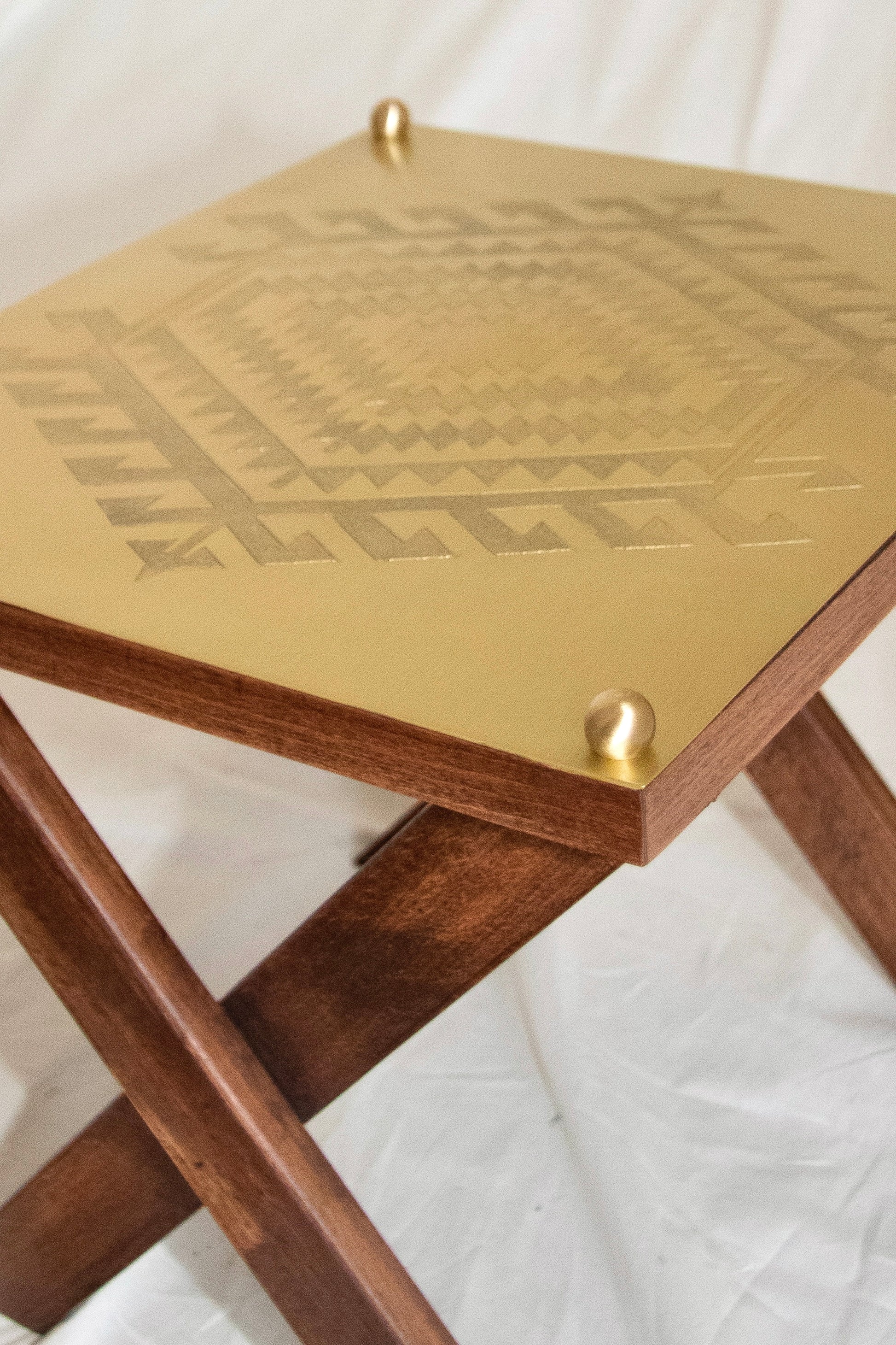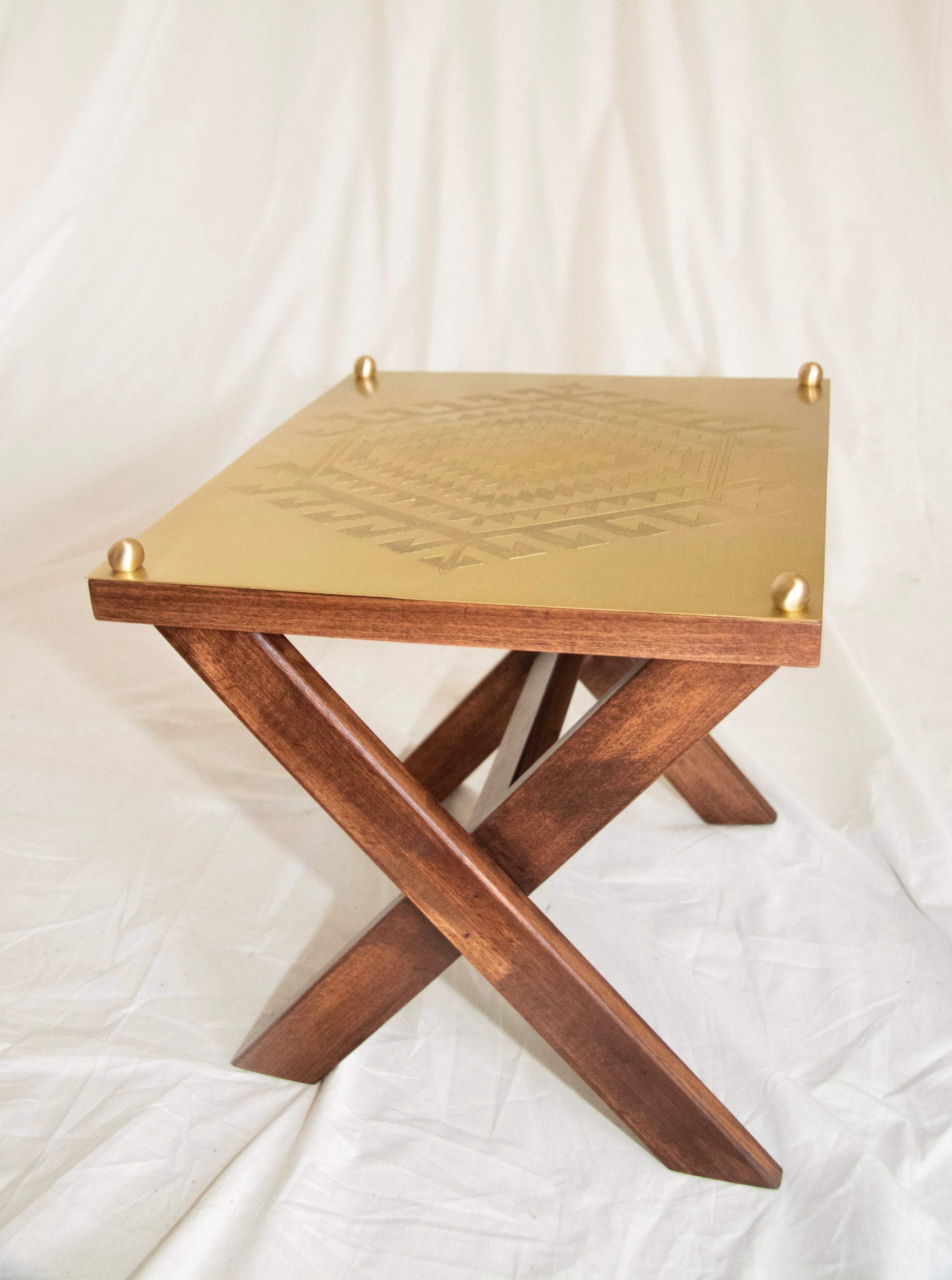 üründe ahşap ayaklar ve elde işlenmiş desenlerle pirinç plaka kullanılmıştır.