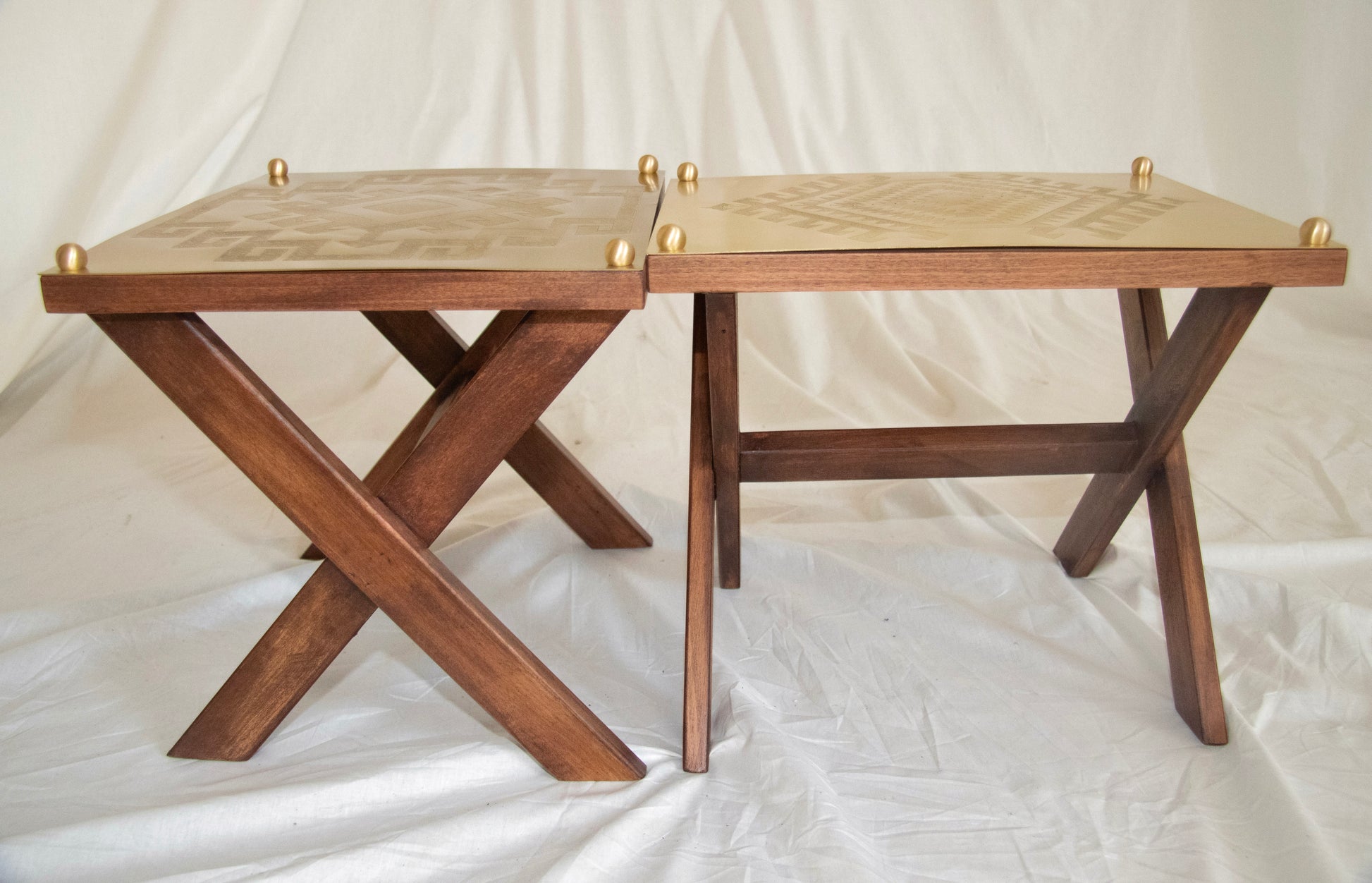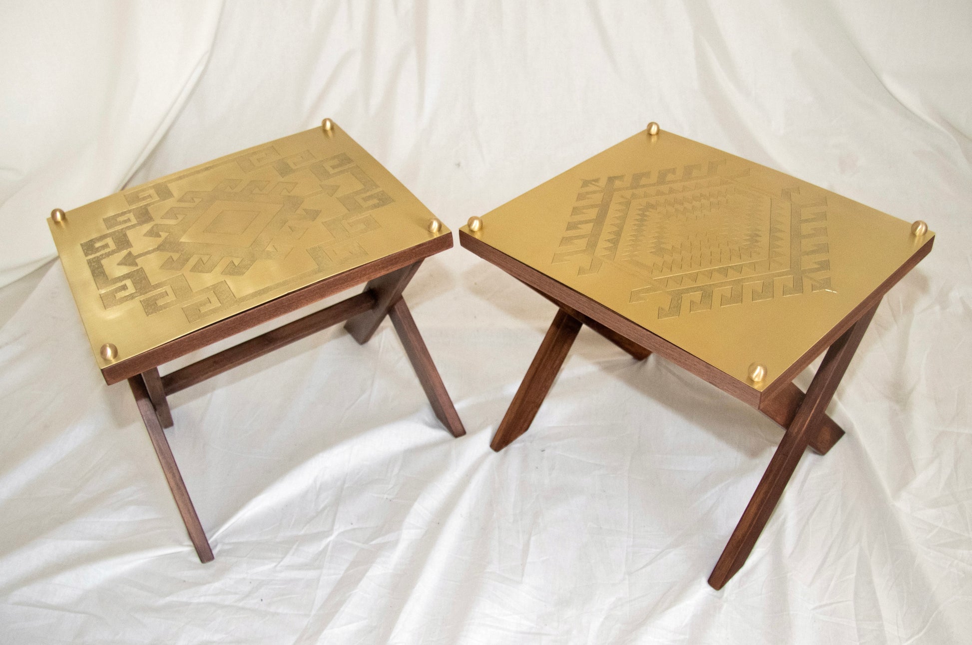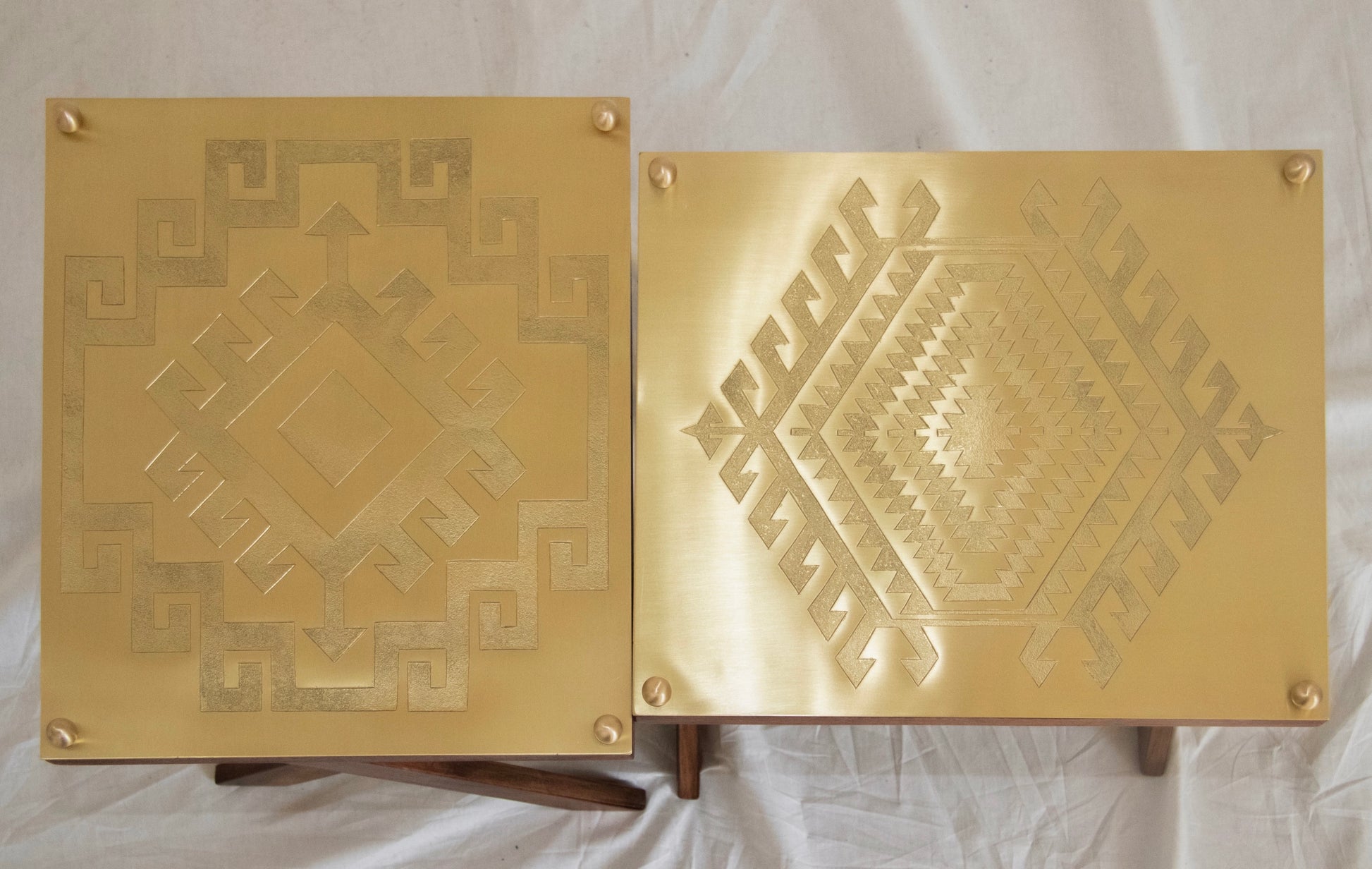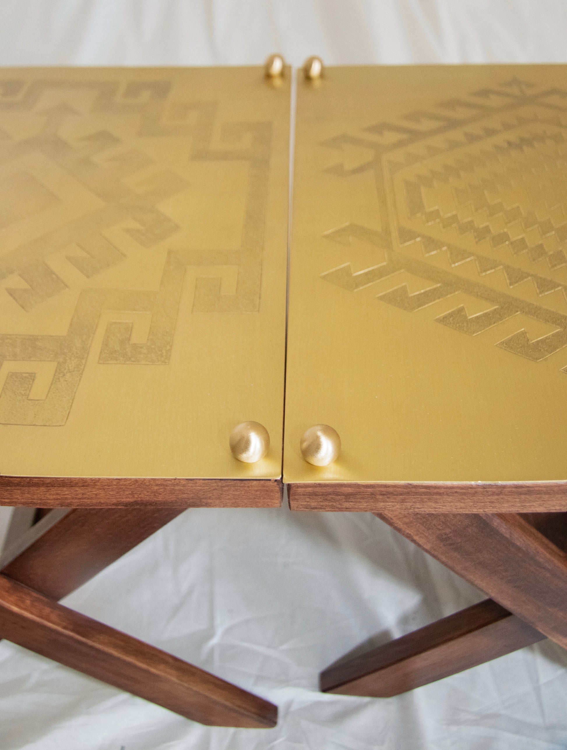 üründe ahşap ayaklar ve elde işlenmiş desenlerle pirinç plaka kullanılmıştır.