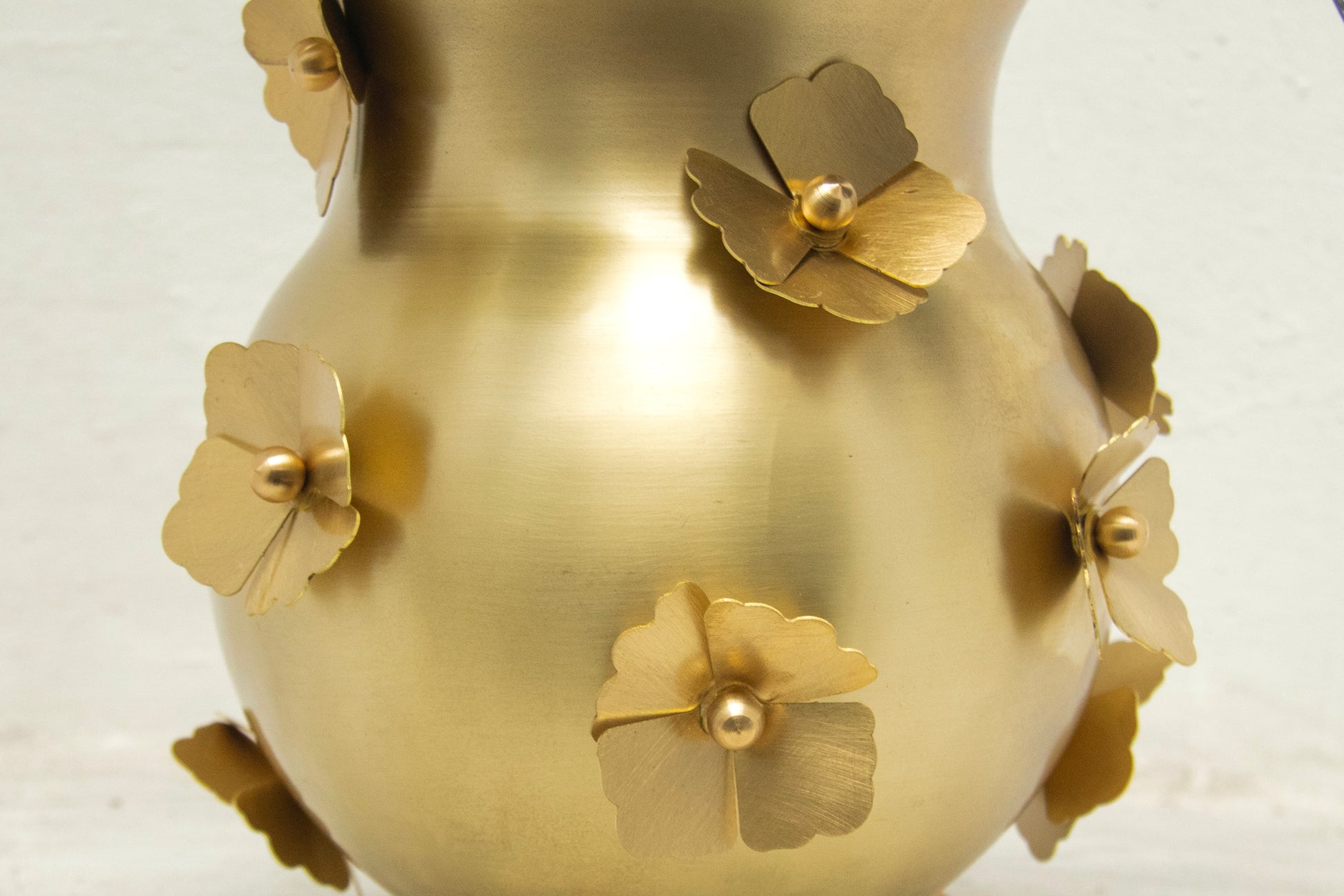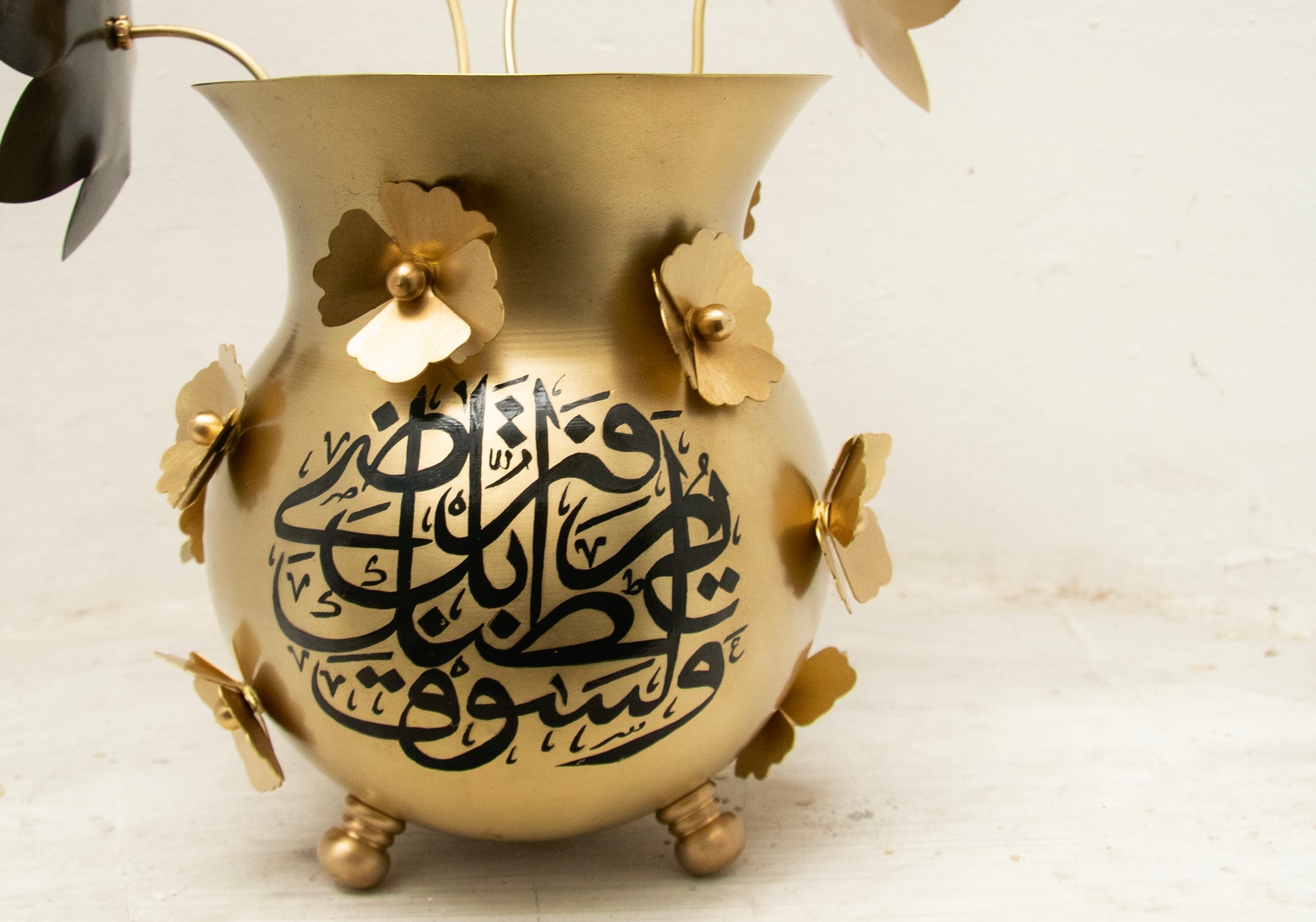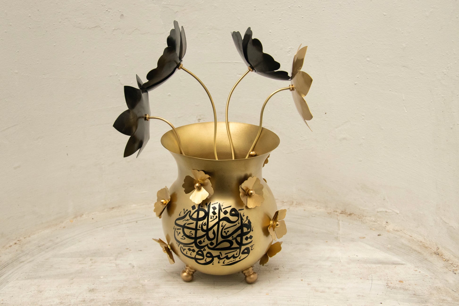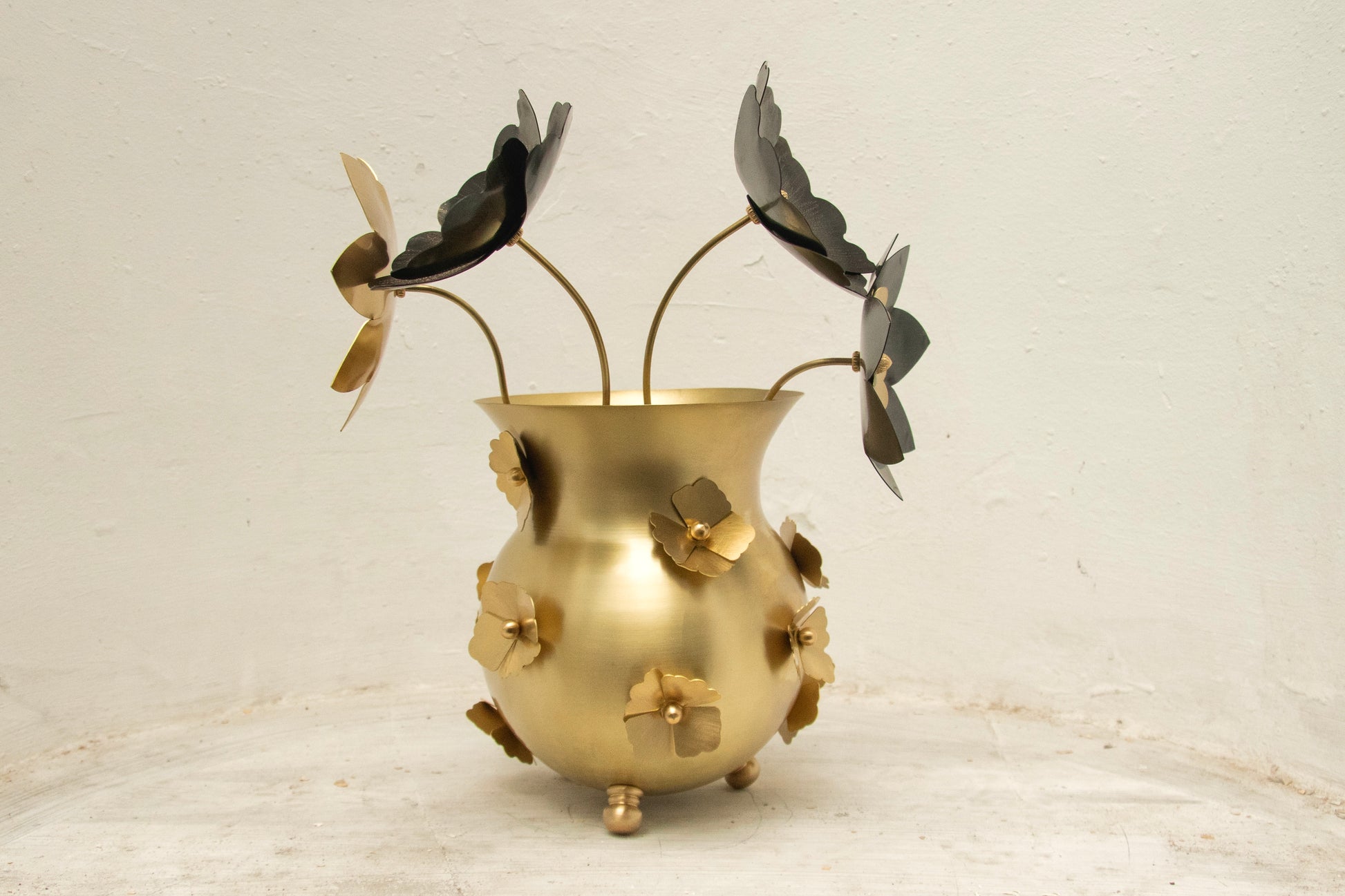 Vazonun gövdesine yerleştirilen el yapımı pirinç menekşe çiçekler, bu hatırlatmanın görsel karşılığıdır. Sabırla beklenen bir duanın ardından açan çiçekler gibi..