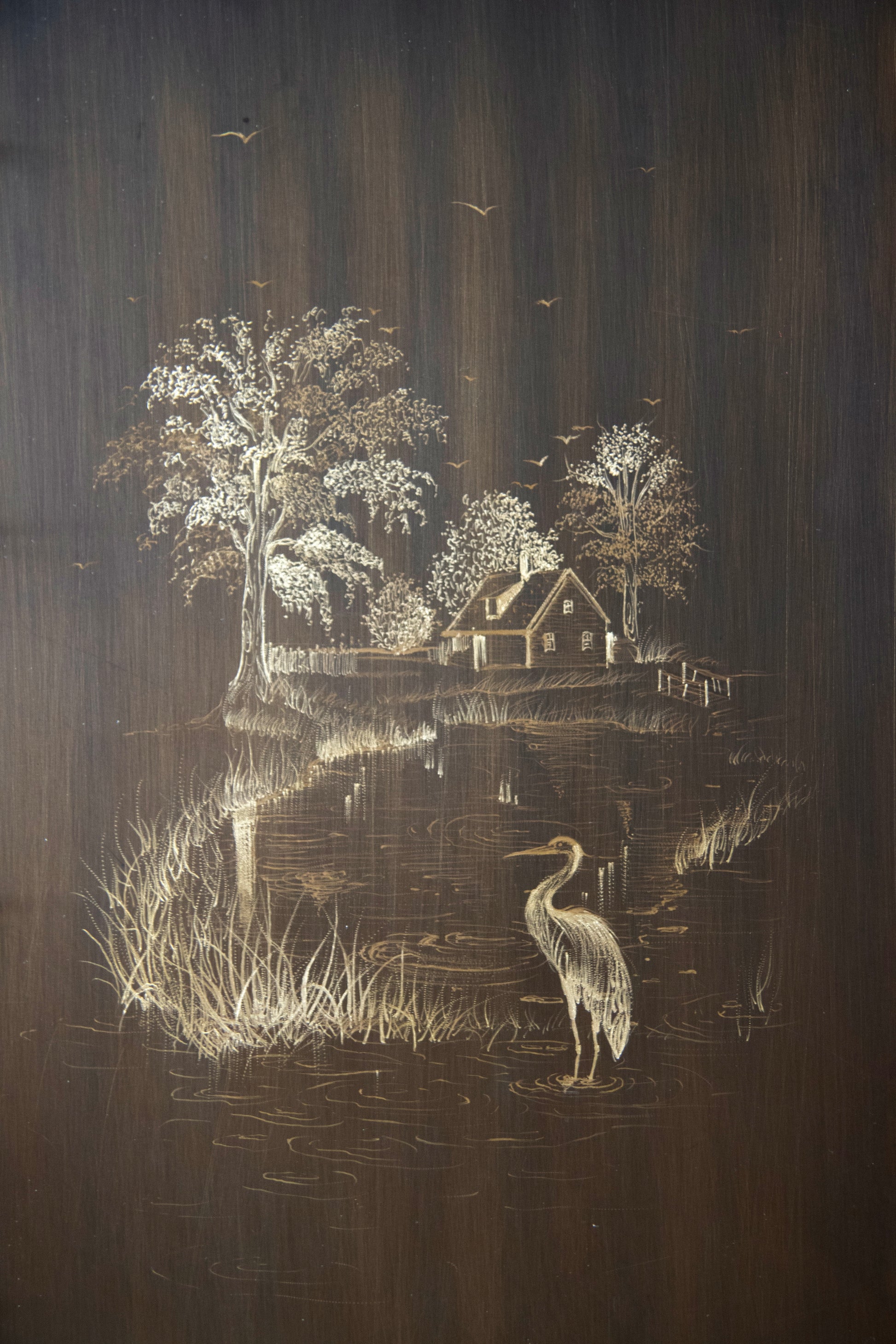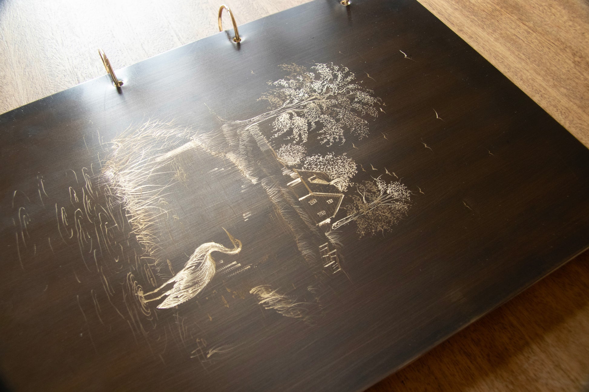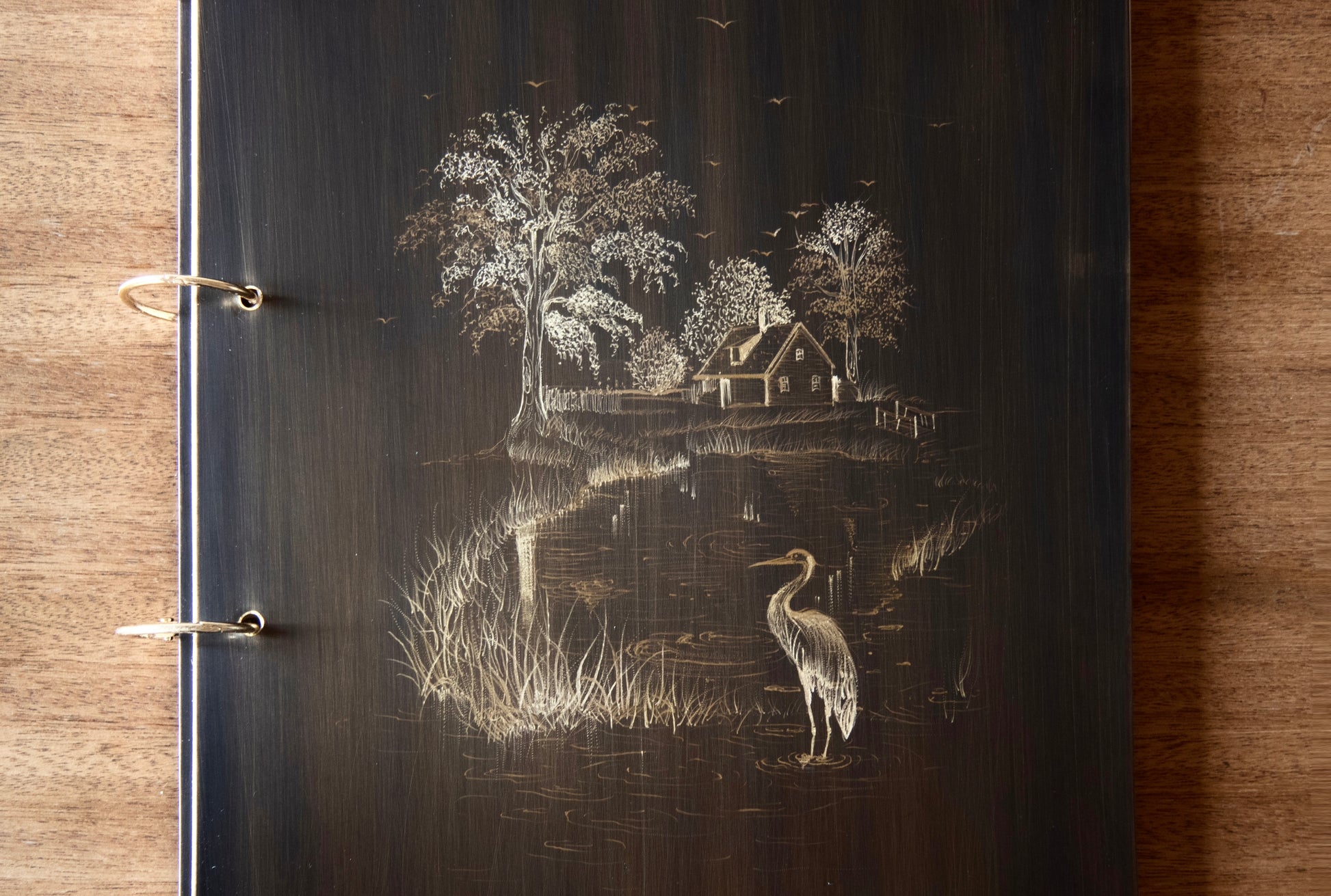 kapaktaki çizim, yüzeyi boyayarak değil; pirincin üzerindeki üst tabakanın ince ince kaldırılmasıyla oluşturuldu. Bu teknik sayesinde altından çıkan doğal altın tonları, hem manzarayı hem de defterin karakterini belirledi.