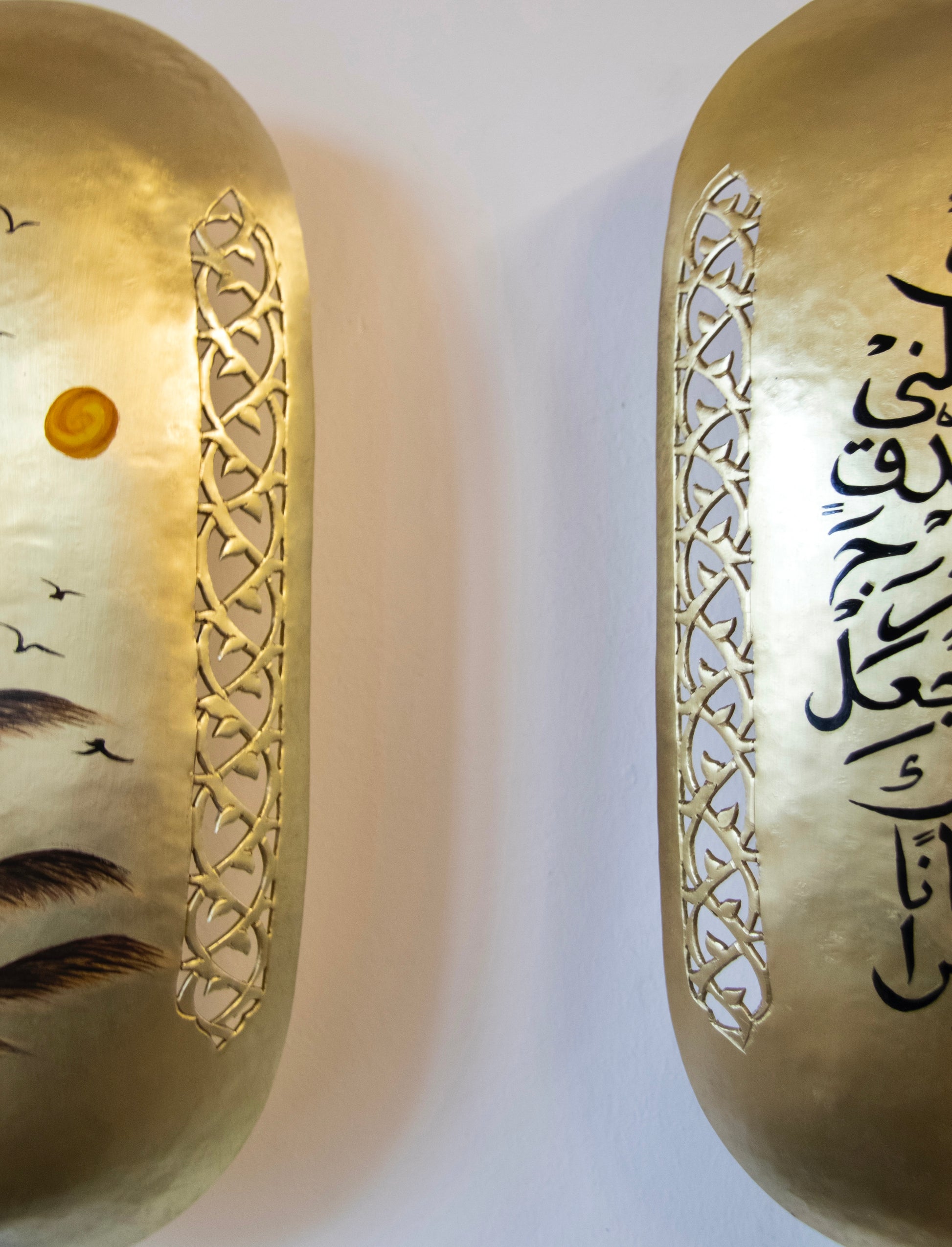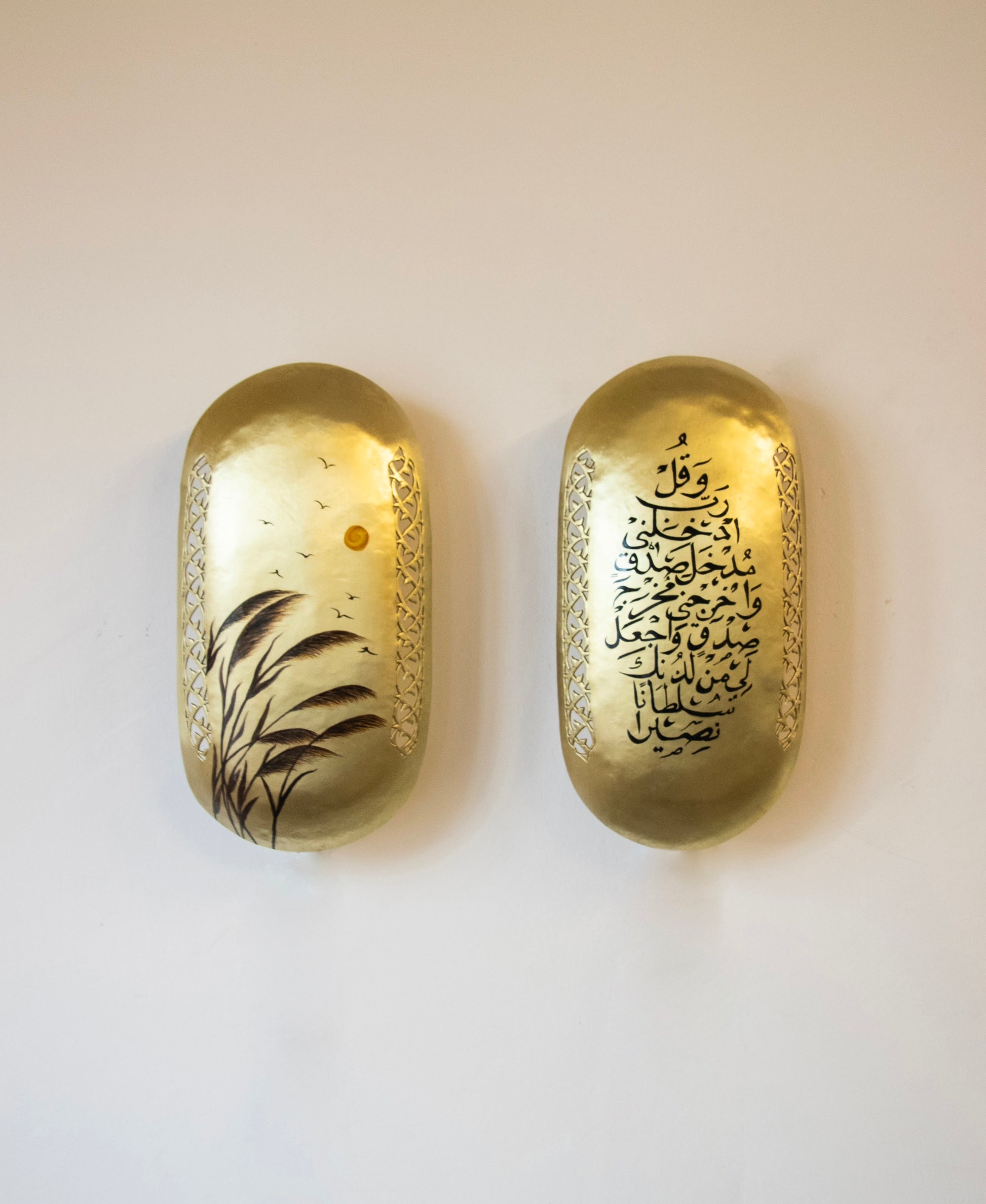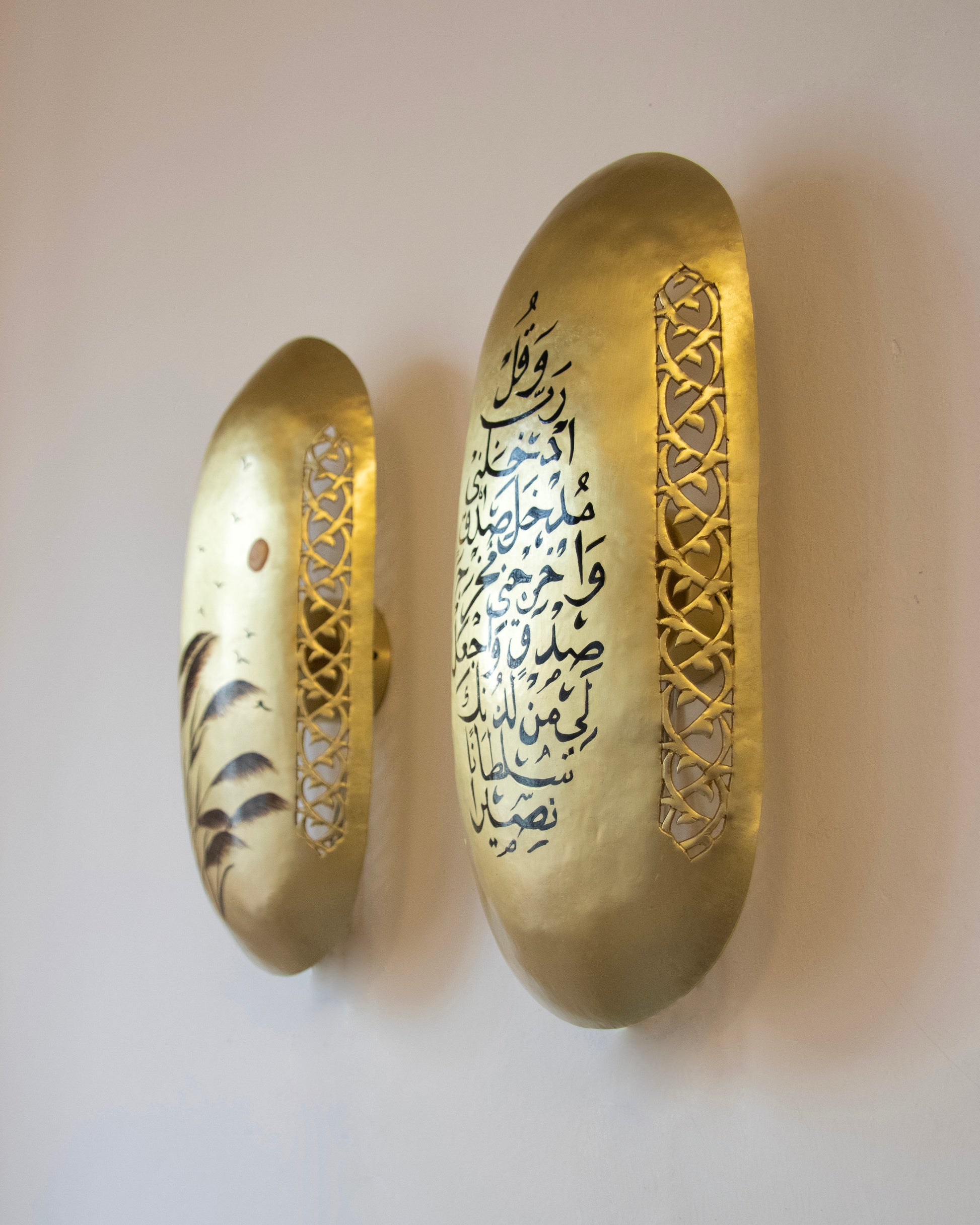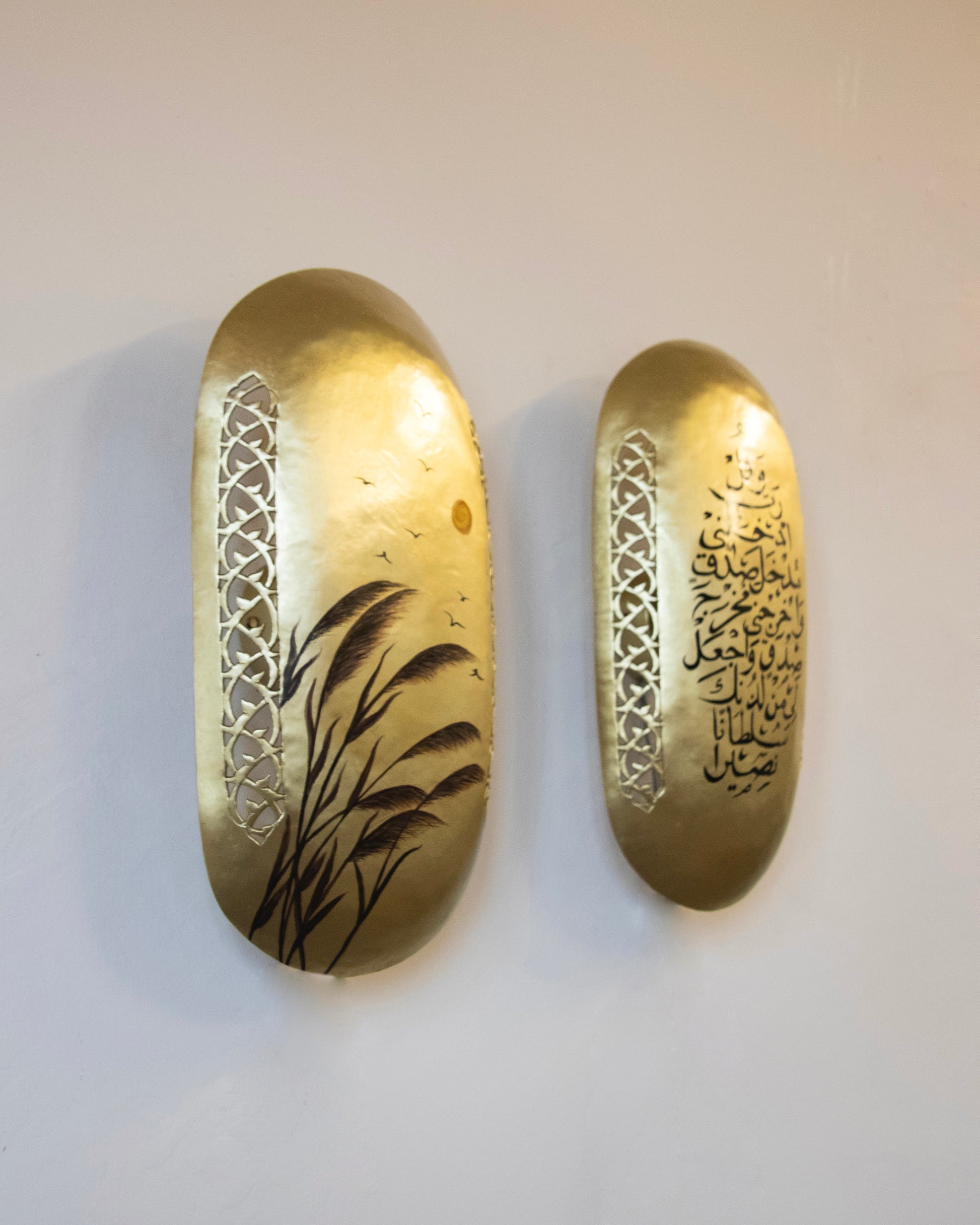 pirinç yüzey üzerine el işçiliğiyle işlenen İsrâ aplik zarif formunu geleneksel tekniklerle modern bir sadelikte buluşturur.