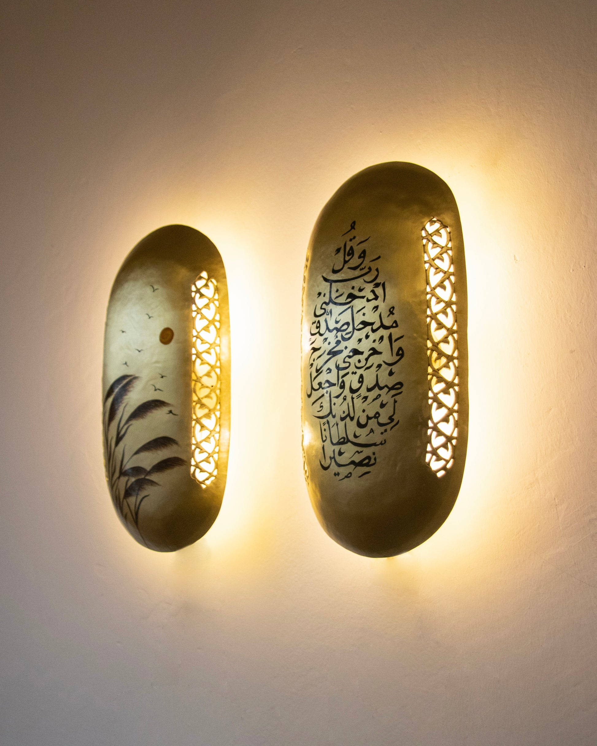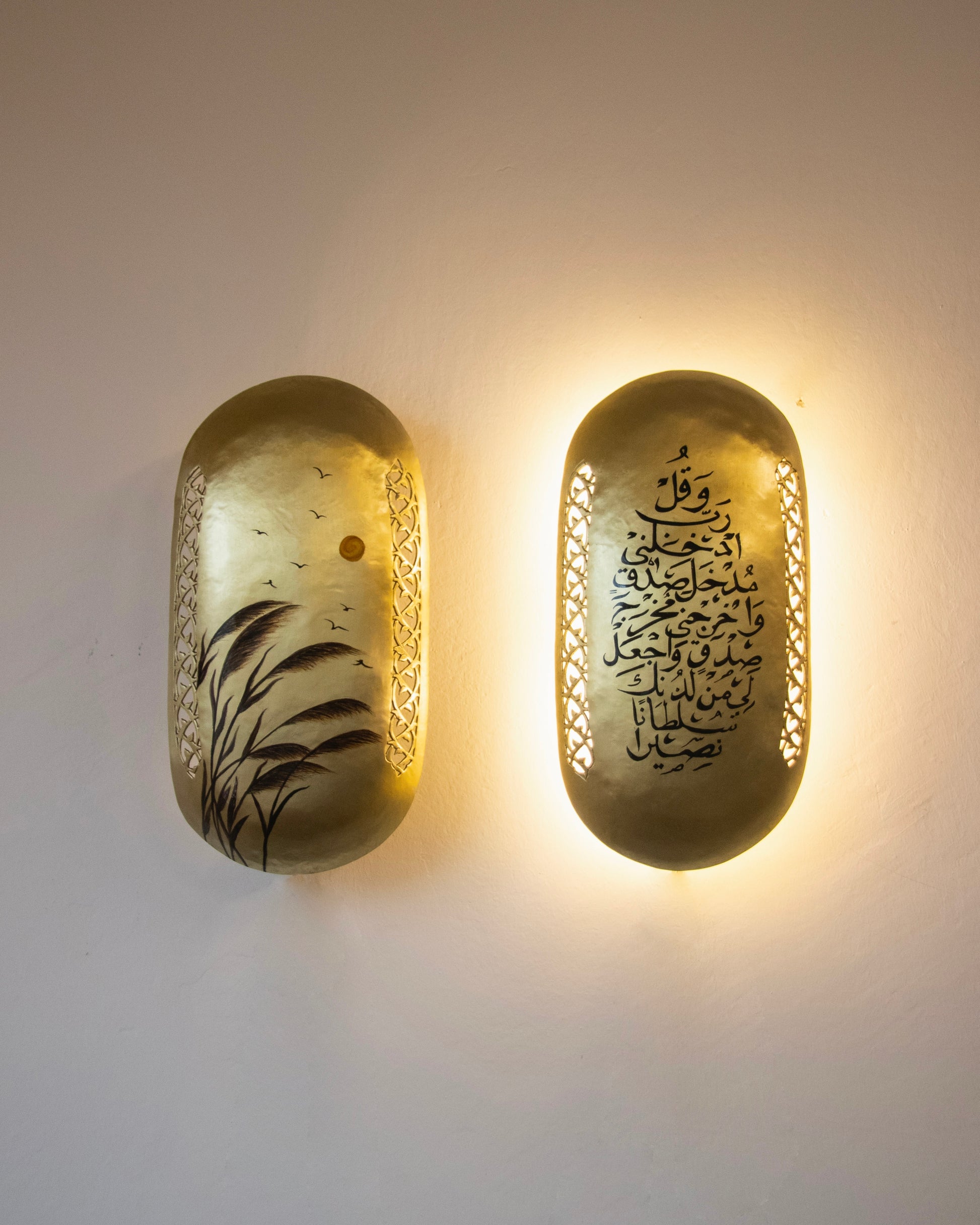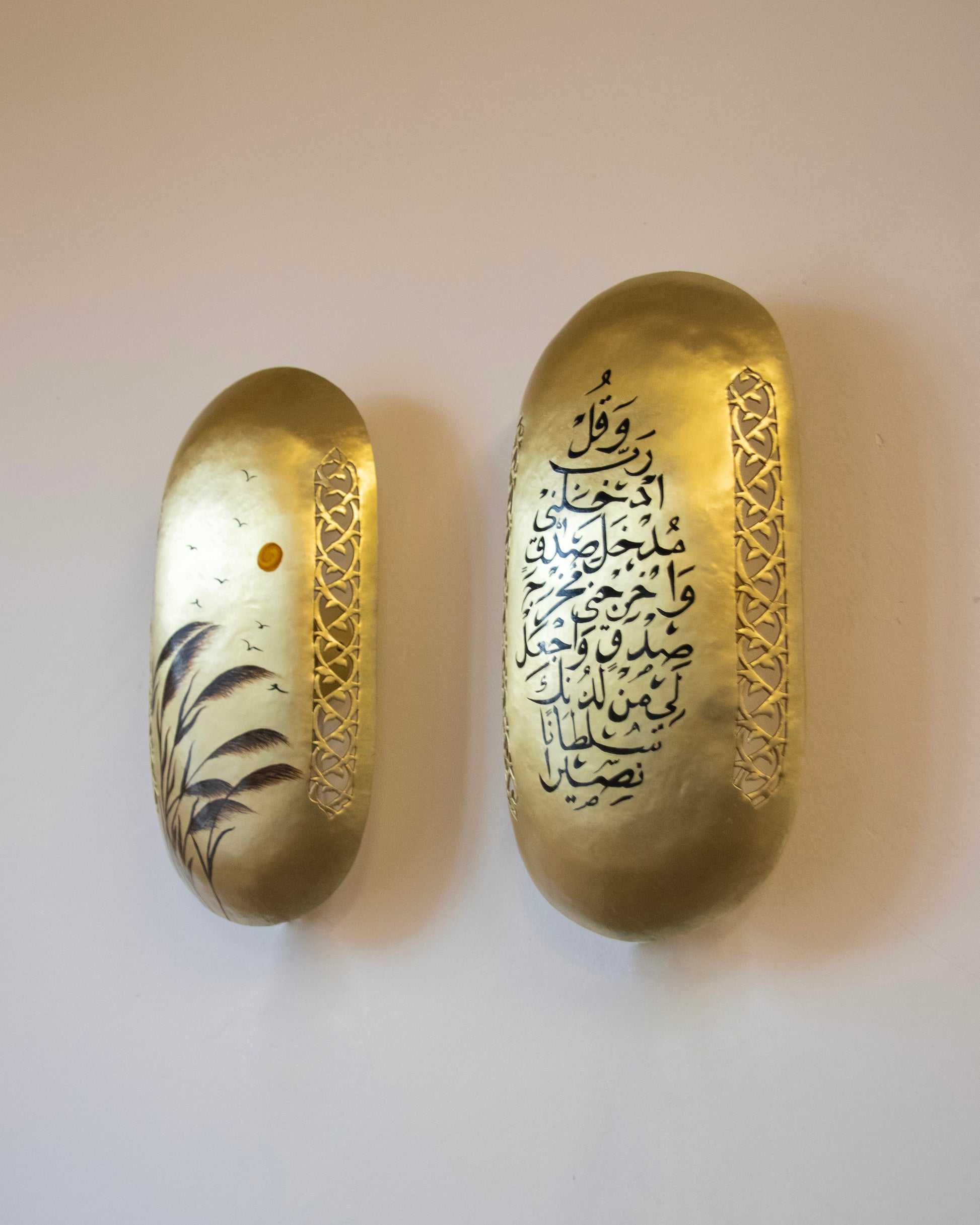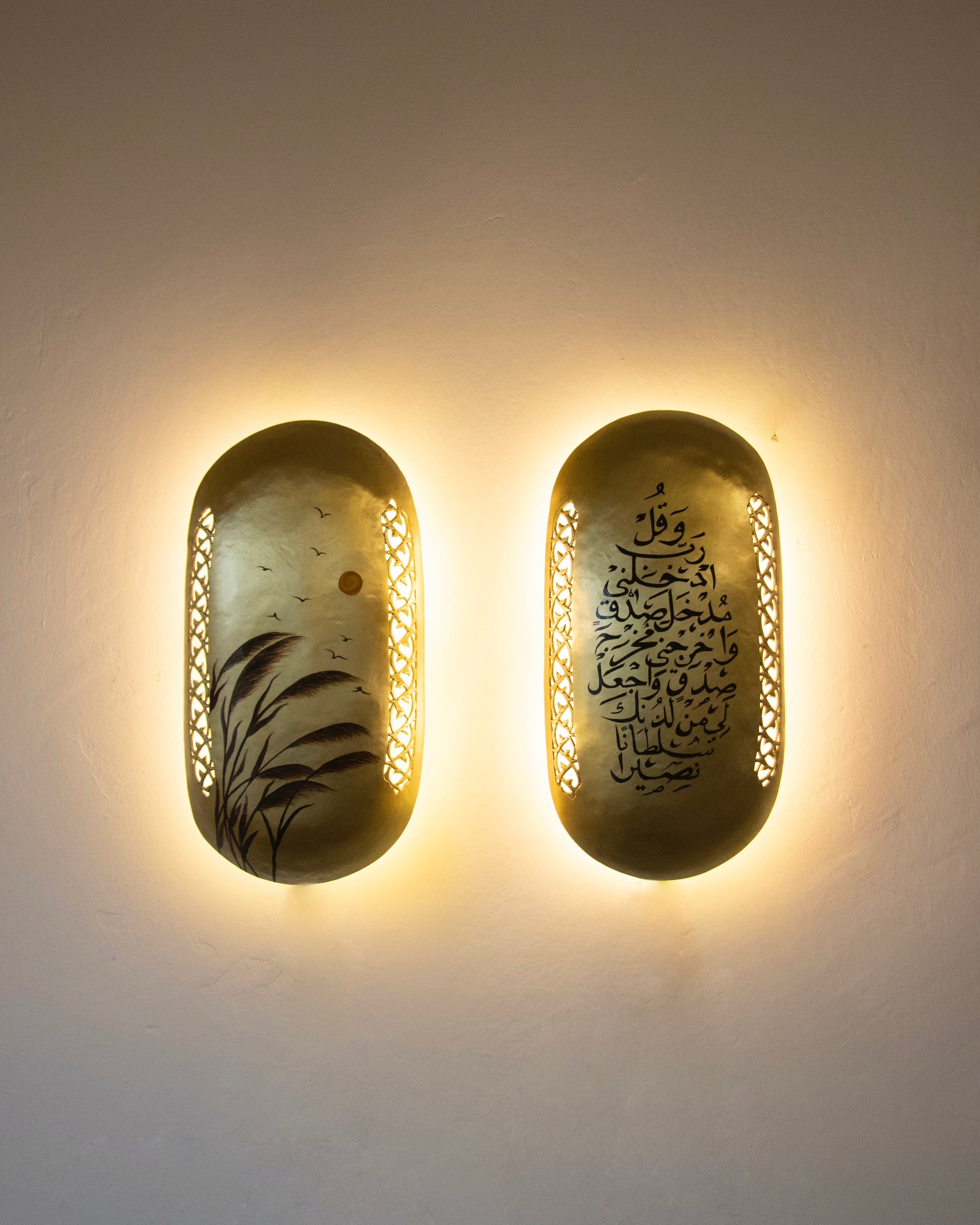 pirinç yüzey üzerine el işçiliğiyle işlenen İsrâ aplik zarif formunu geleneksel tekniklerle modern bir sadelikte buluşturur.