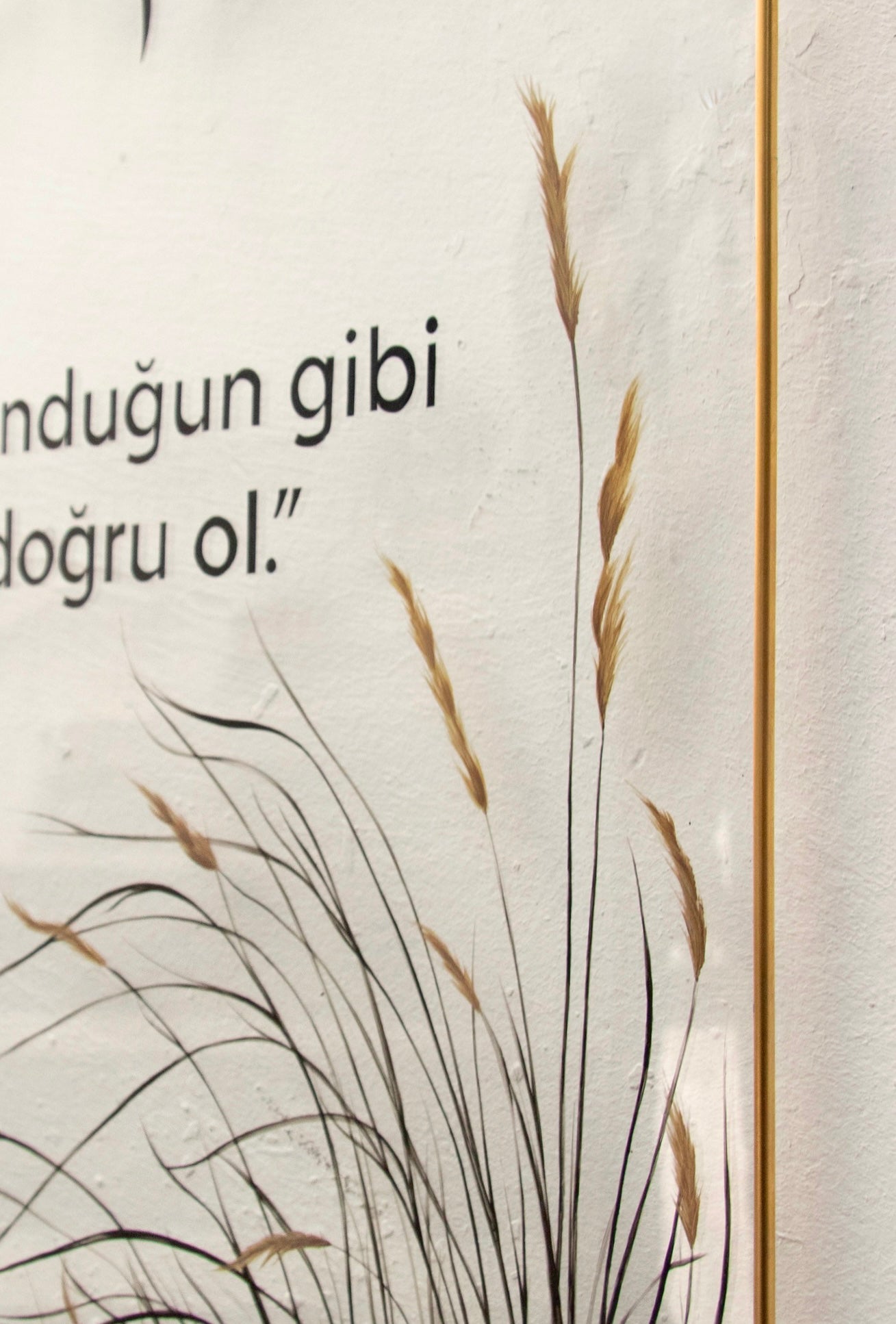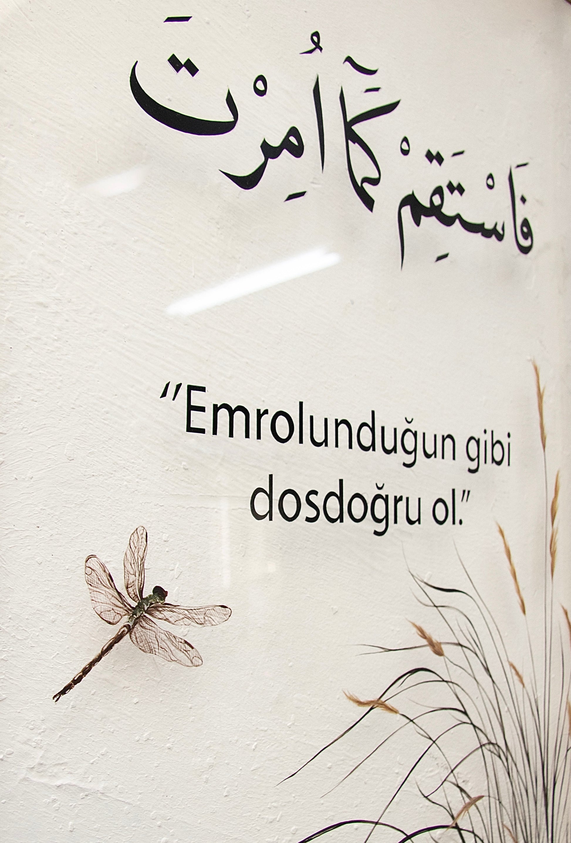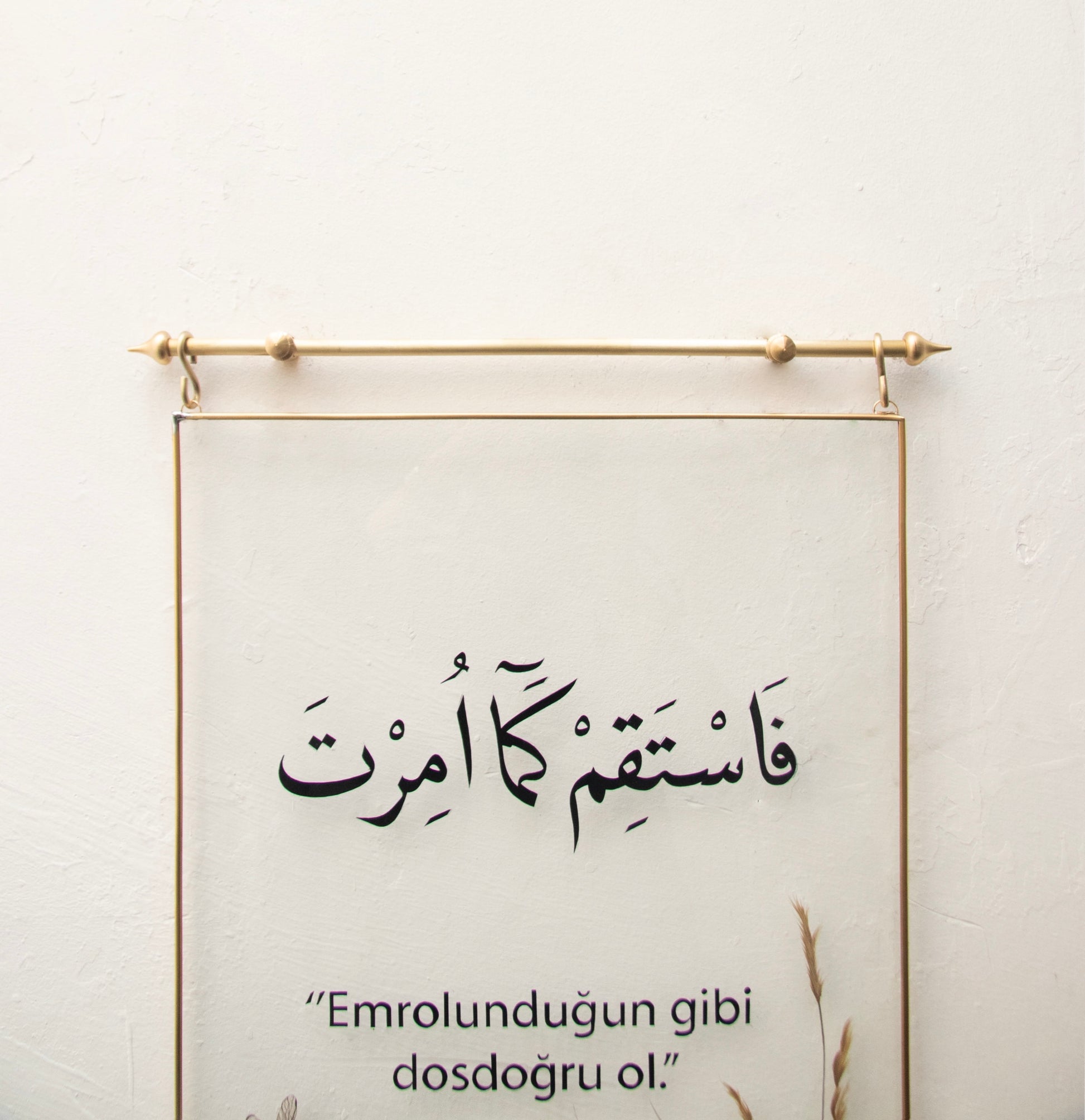 görseldeki eserde sülüs yazı stilinde ''Hûd Sûresi 112. ayet'' yazmaktadır.